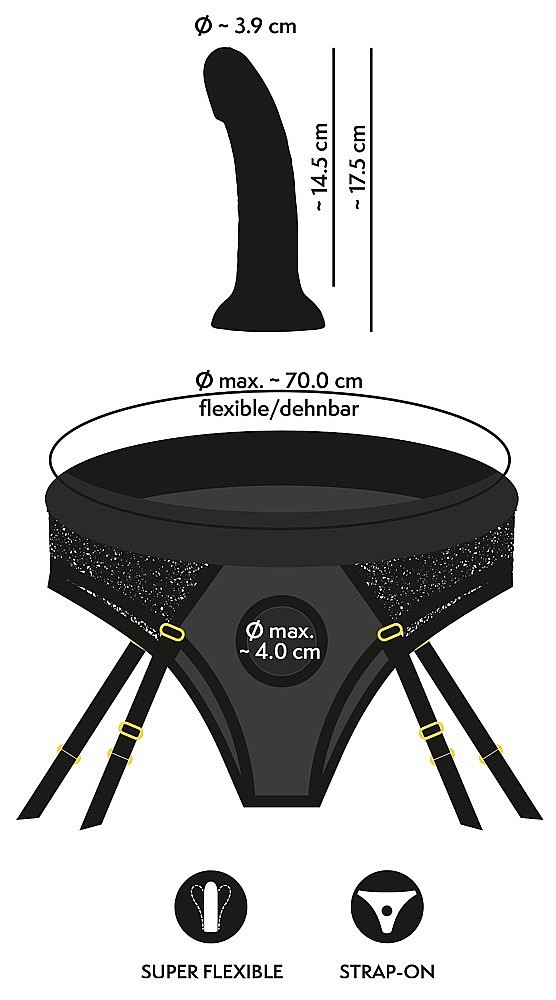 El consolador se mantendrá firmemente en su lugar incluso durante embestidas intensas. ¡Ideal para disfrutar aún más con tu pareja! La braguita negra está hecha de una mezcla elástica de microfibra y encaje que garantiza la comodidad.